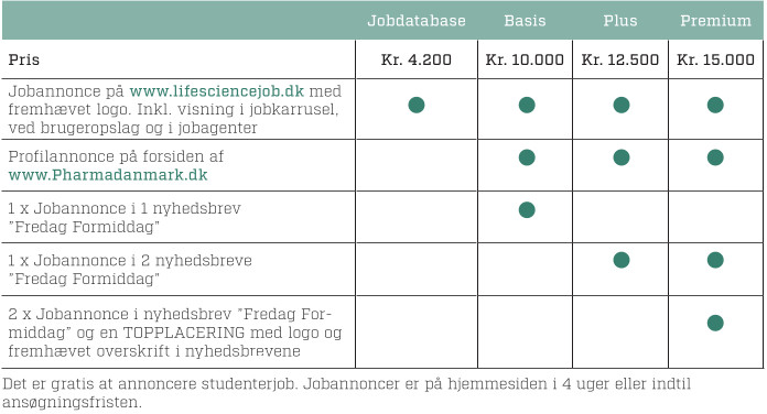 Priser på fremhævede jobannonce på lifesciencejob.dk samt indrykning i nyhedsbreve og profilering på pharmadanmark.dk